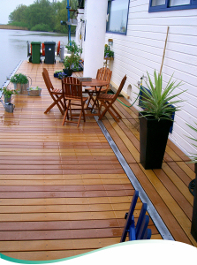 Een ideale combinatie: geen speciale constructie aan uw woonboot, maar leg simpelweg één of meer drijvende steigers naast uw woonboot en u beschikt in een keer over vele vierkante meters steiger of terras.